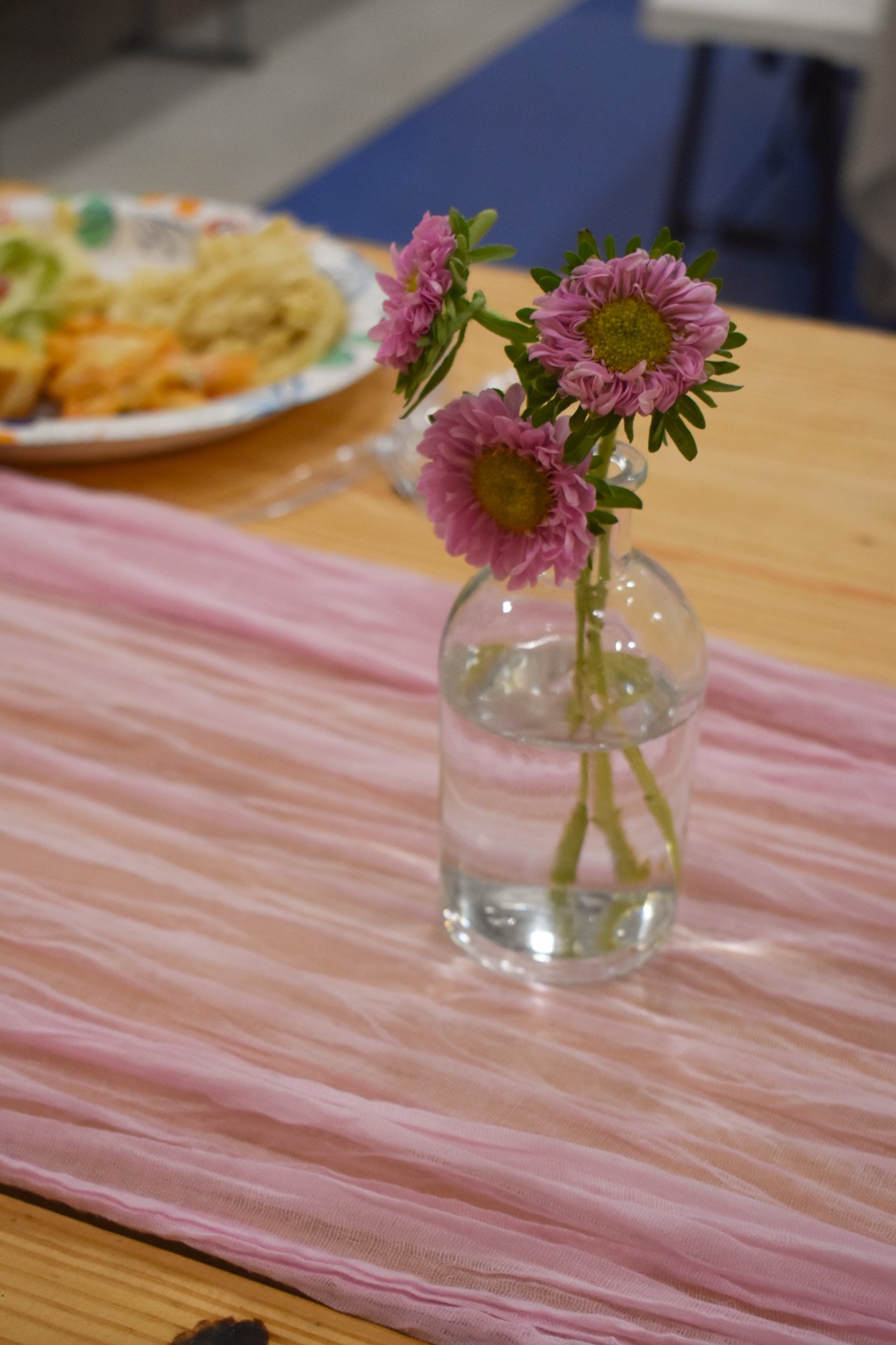As the guests ate and mingled, everyone was having a great time. Laughter and smiles filled the room. To create such a welcoming environment we set the tables with our Canvas Tablecloths and Pink Runners. To top it off, we added a Petite Arrangement. The simplicity was perfection. After eating, we all gathered and played a couple of games.