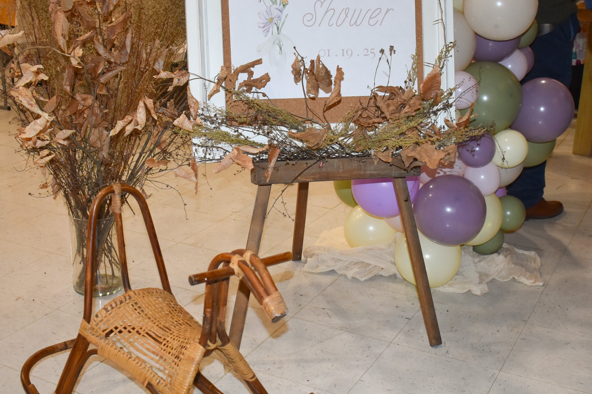 As guests entered the fellowship hall, they were greeted with a beautiful welcome sign. We placed an Ultra Balloon Tower and a Dried Statement Arrangement behind the sign. It capped off the entrance perfectly and made a stunning first impression.