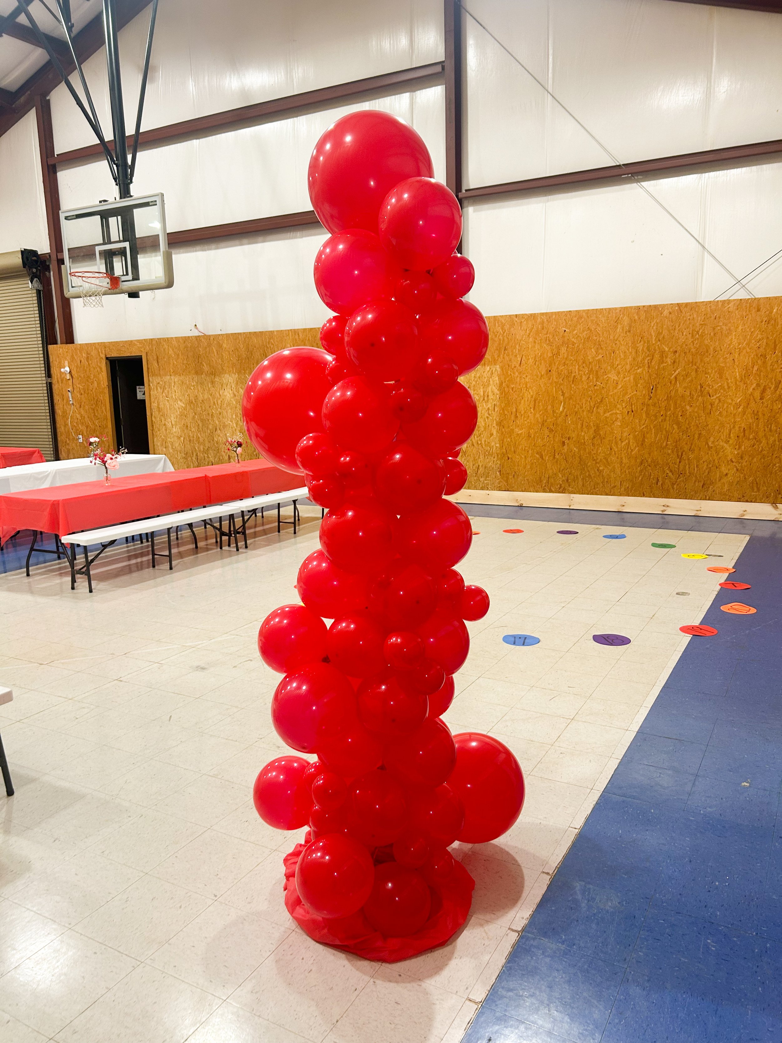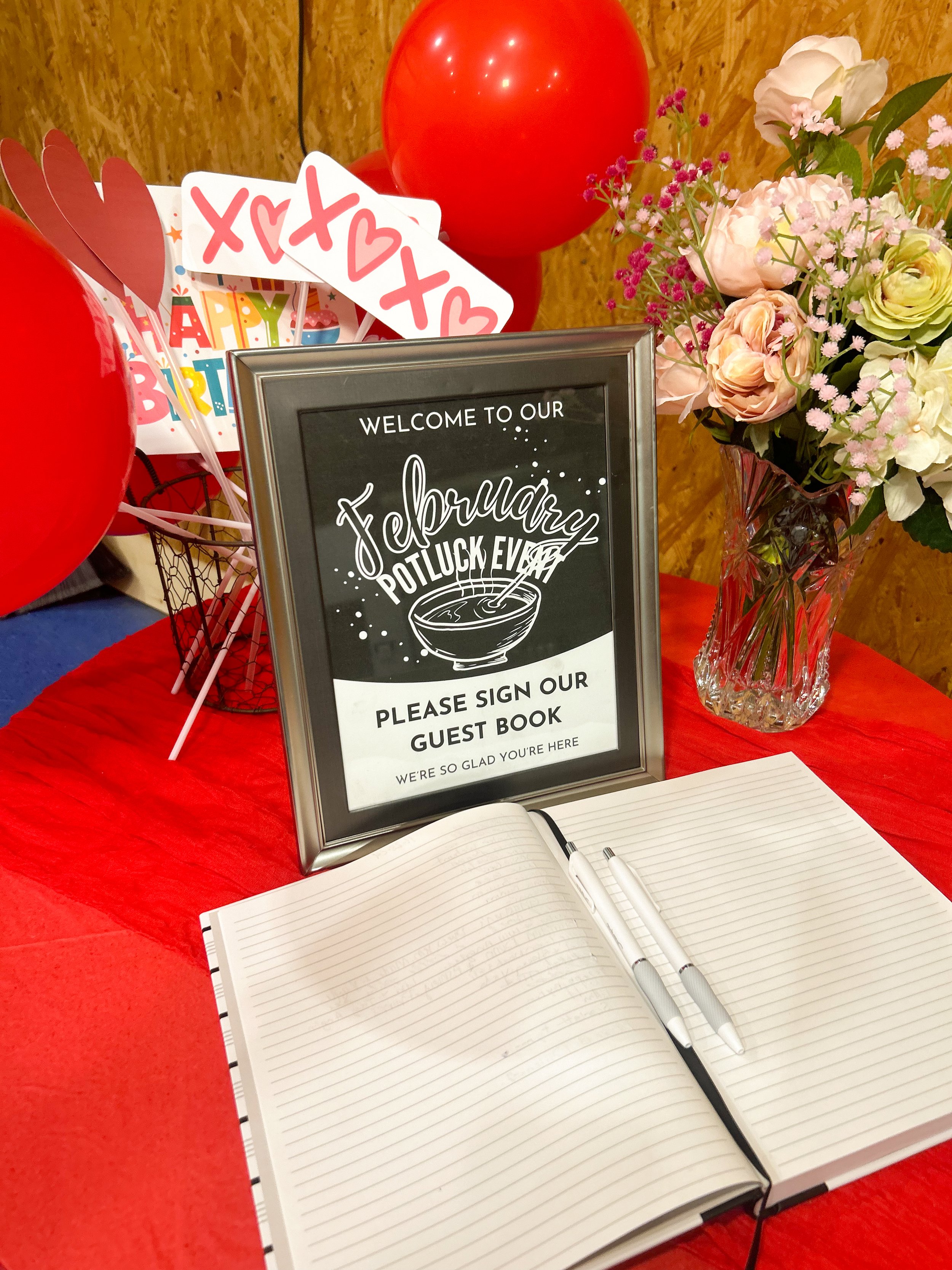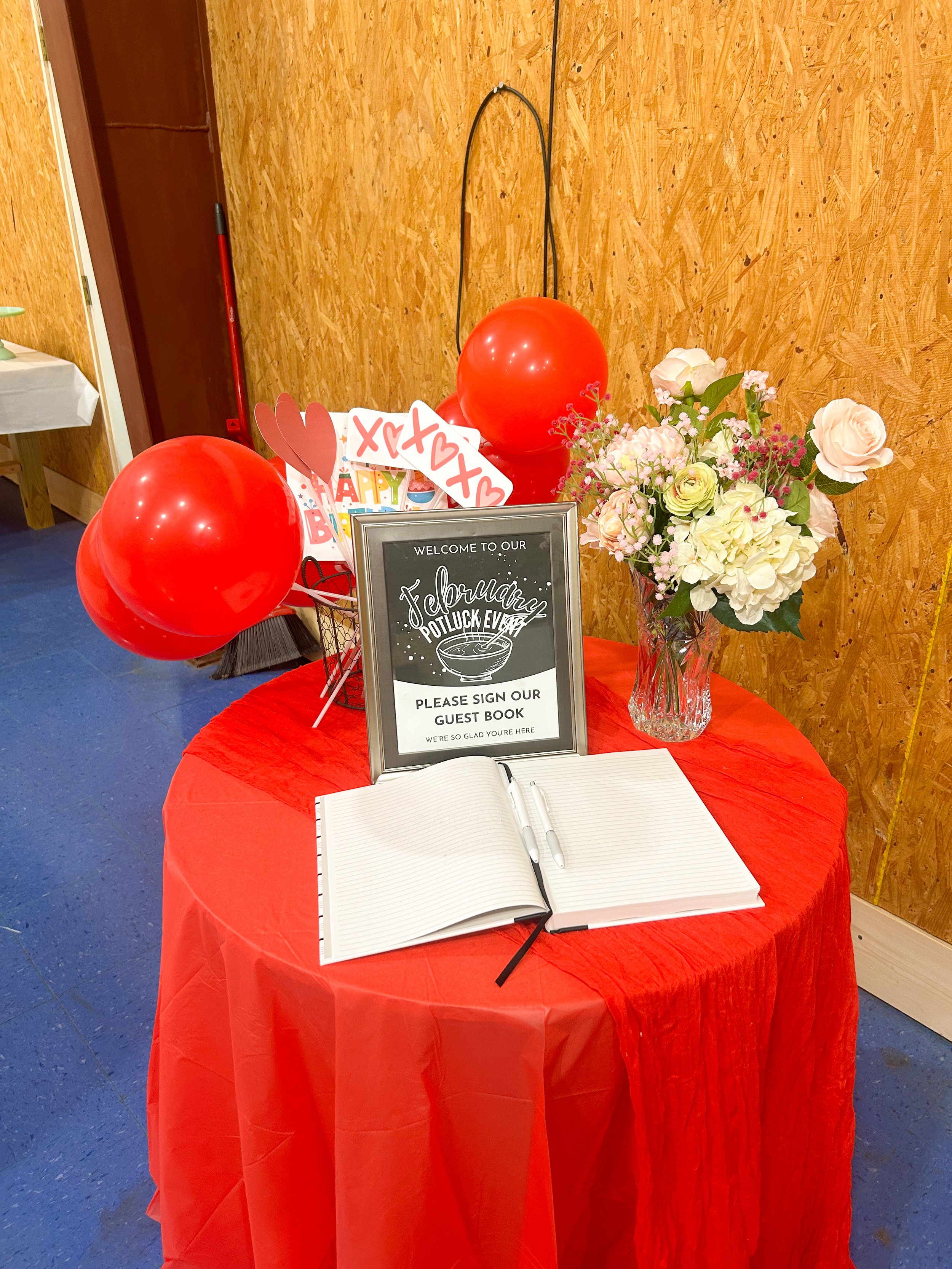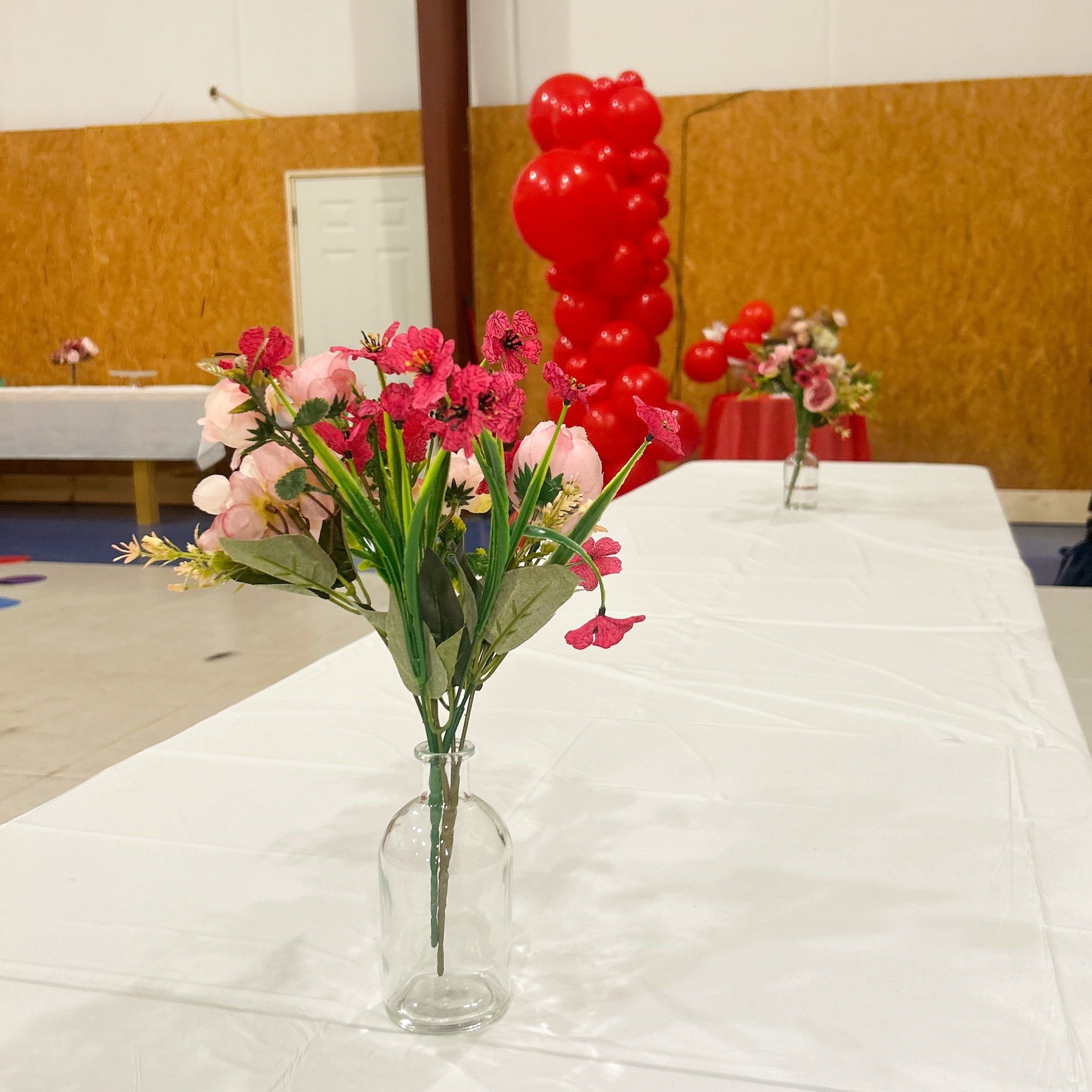 This month, we embraced a Valentine's Day theme with red, pink, and white accents. We crafted a stunning, ultra-original balloon tower and added a few artificial floral arrangements to dress up the tables. The scene was set for a perfect potluck.