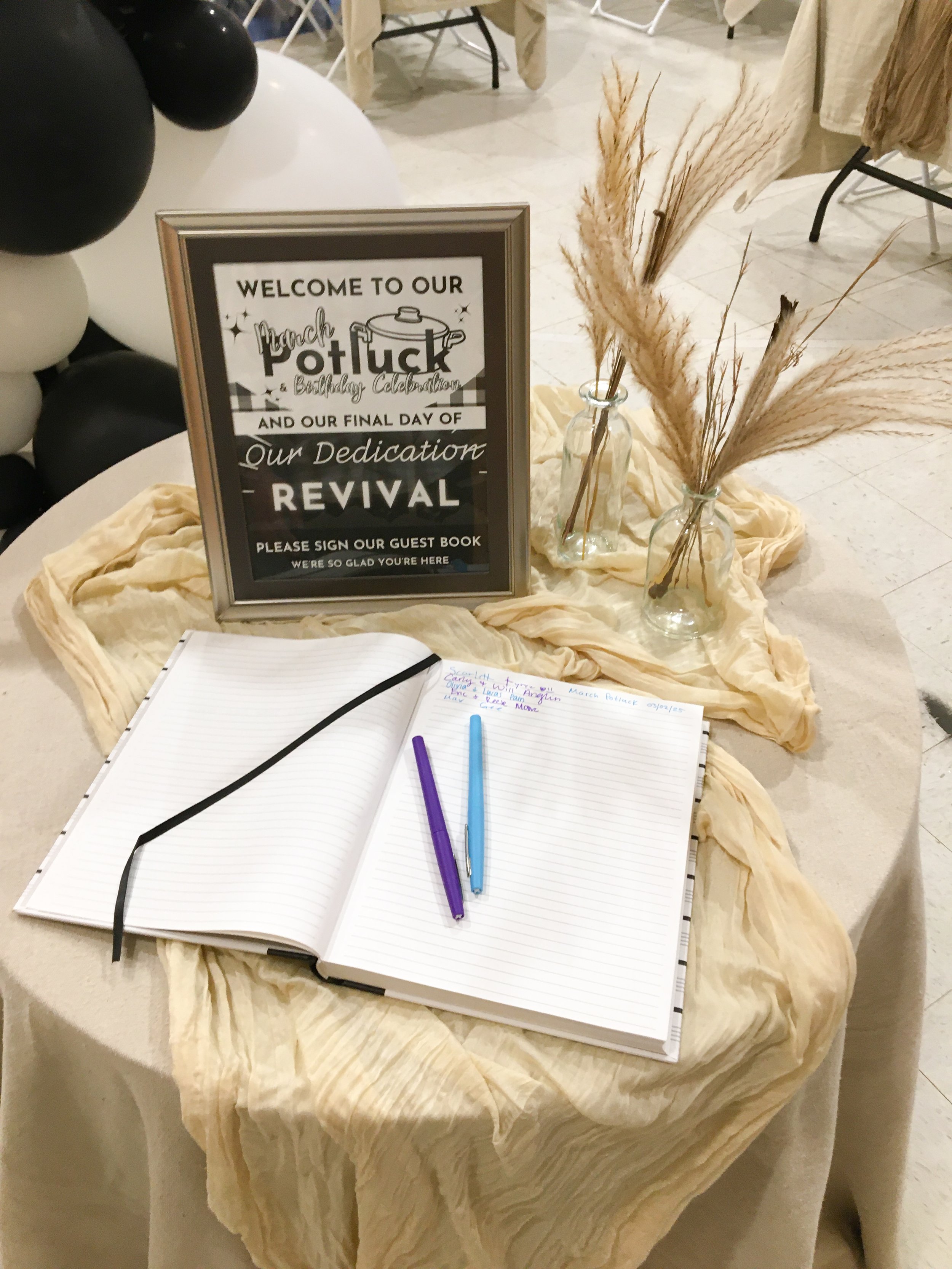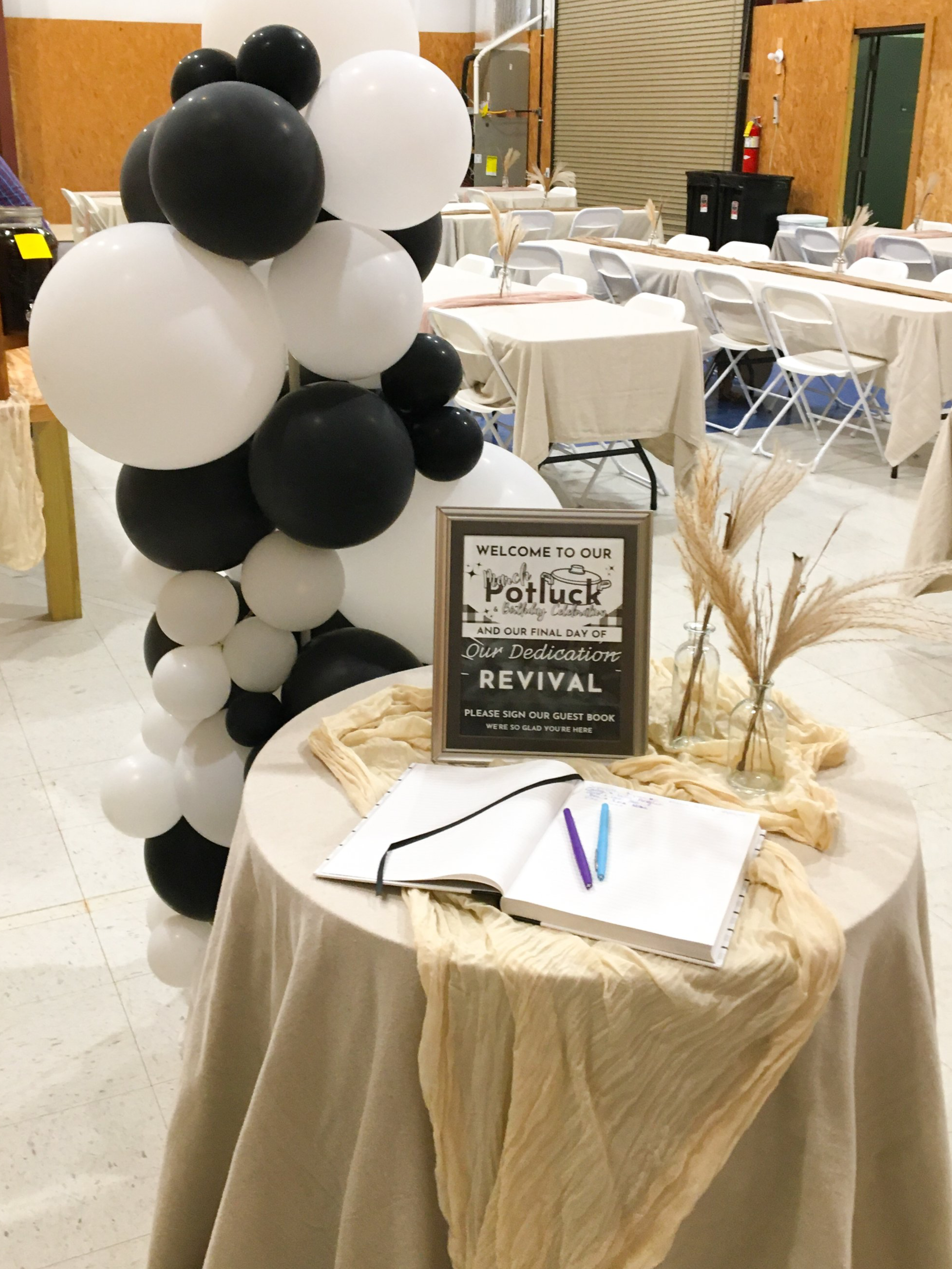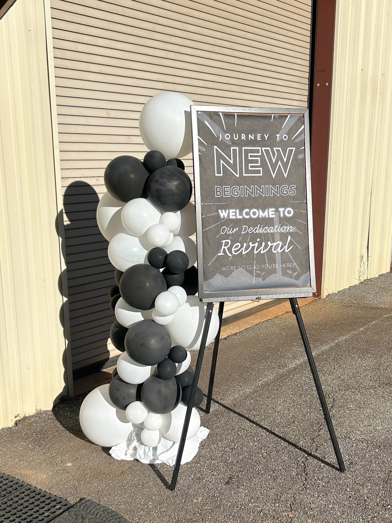 We were thrilled to be a part of a special event. New Beginnings hosted their Dedication Revival and we had the honor of decorating. We created and printed a 24x32 welcome sign to greet everyone as they arrived, adding the Max Furmxn touch with an Ultra Original Balloon Tower in black and white.