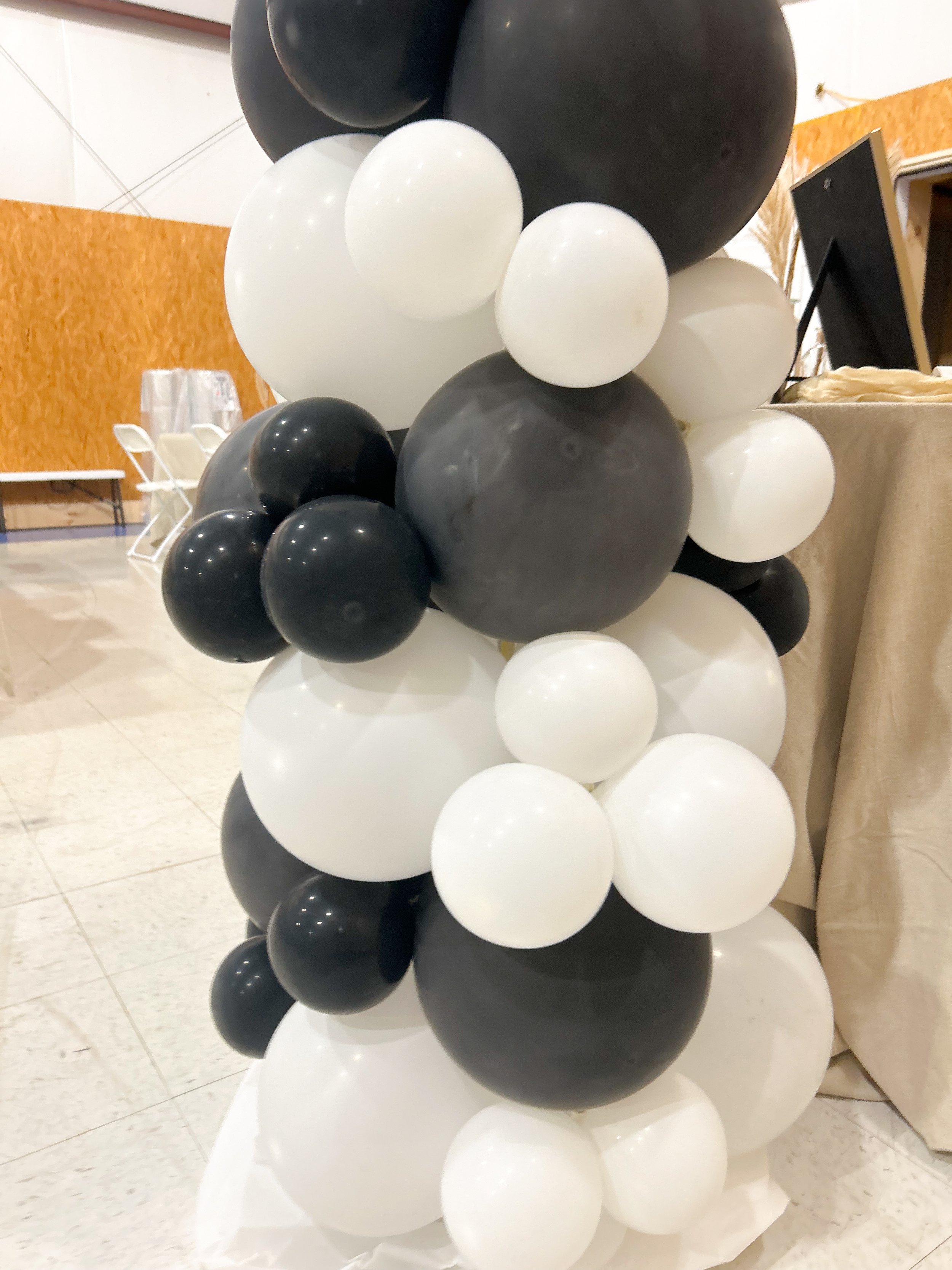 Upon entering the fellowship hall, guests were welcomed with a welcome table, where we displayed the guestbook alongside a smaller 8x10 welcome sign. We added another black and white Ultra Original Balloon Tower and complemented the display with a dried petite arrangement.