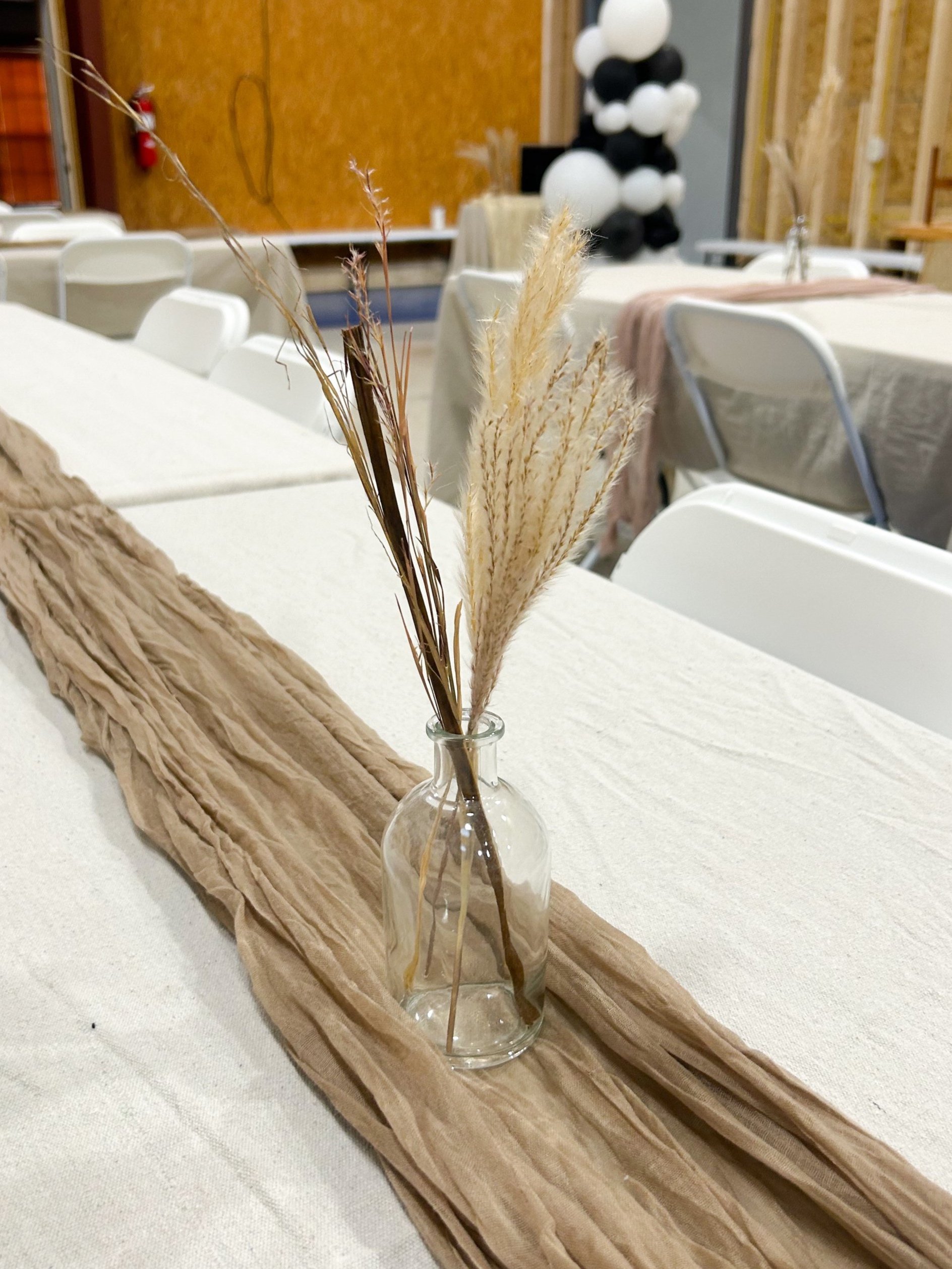 To dress up each table, we used our favorite canvas tablecloths and layered in a beige cheesecloth runner to create some texture. Each table was finished with a petite dried floral arrangement.
